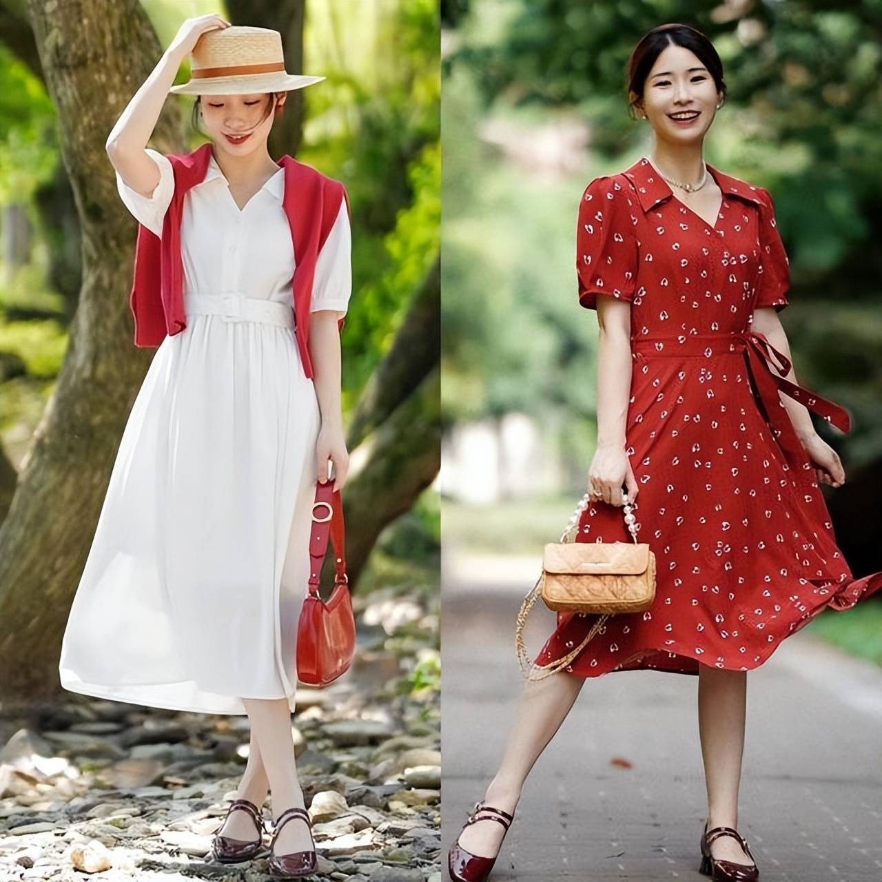 除了短款上衣和高腰裤装的组合方式来讲,在穿搭连衣裙的时候也要懂得使用高腰款的设计方式来彰显出完美的身材比例。